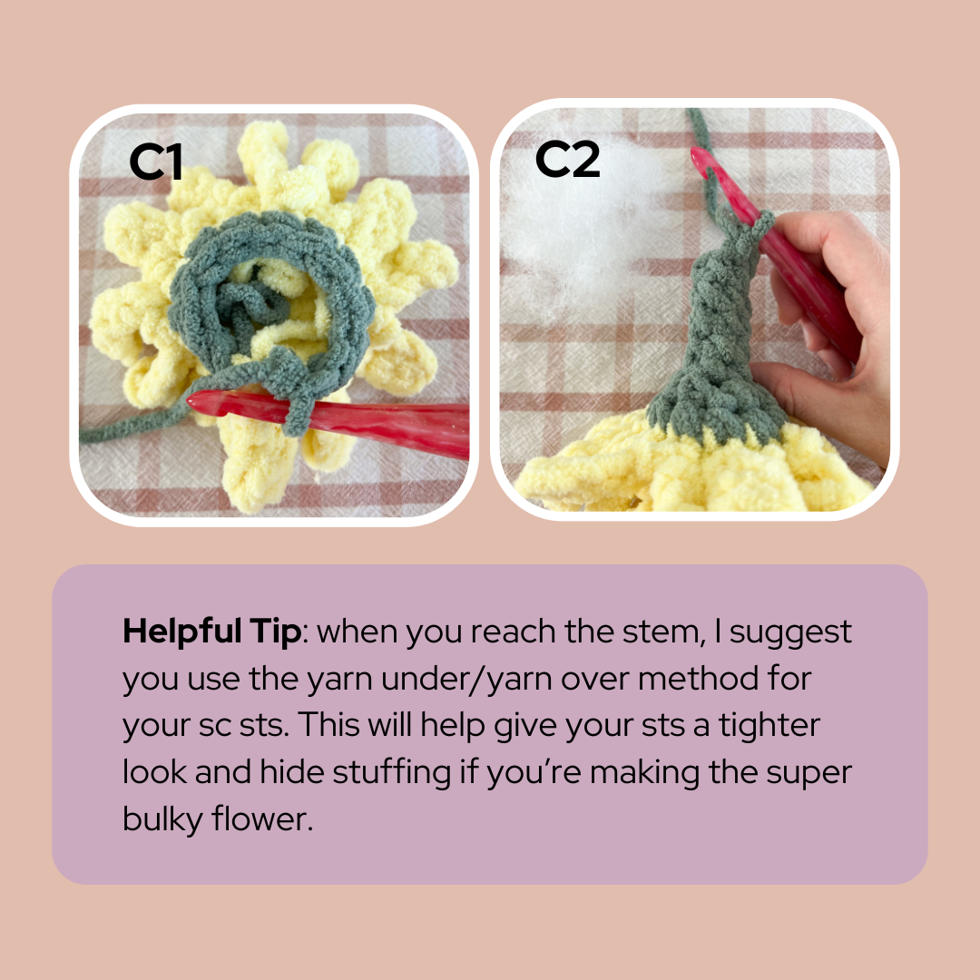 Stop every few rnds to lightly stuff. You want it to be enough to keep its form, but not too much to where the stuffing shows through the stem (photo C2).