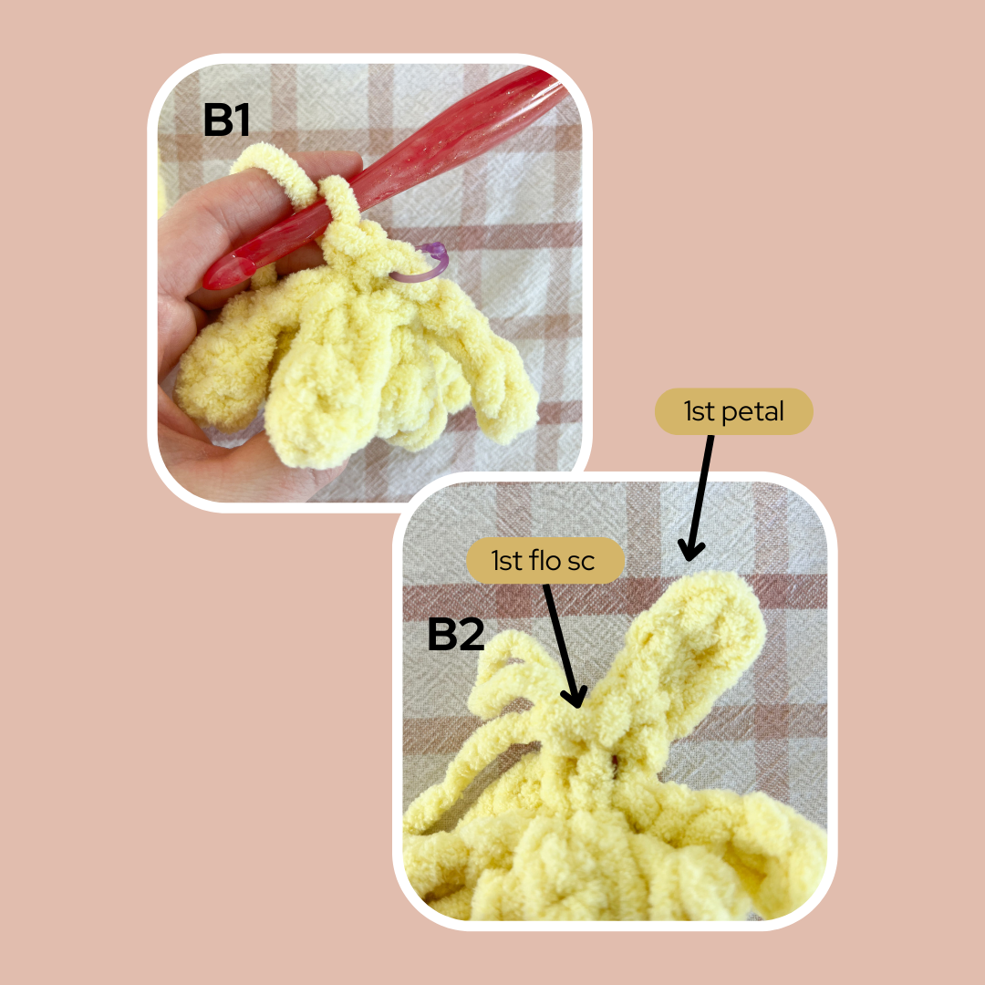Rnd 6: flo sl st in 1st st, ch 4, hdc in 2nd ch from hook, hdc in next ch, sc in next ch, sl st to beg st, flo sc in next st (photo B2), (flo sl st in next st, ch 4, hdc in 2nd ch from hook, hdc in next ch, sc in next ch, sl st to beg st, flo sc in next st) x 11, change to Color B in the last st of the rnd (see tip below). (12 petals, 12 sc)