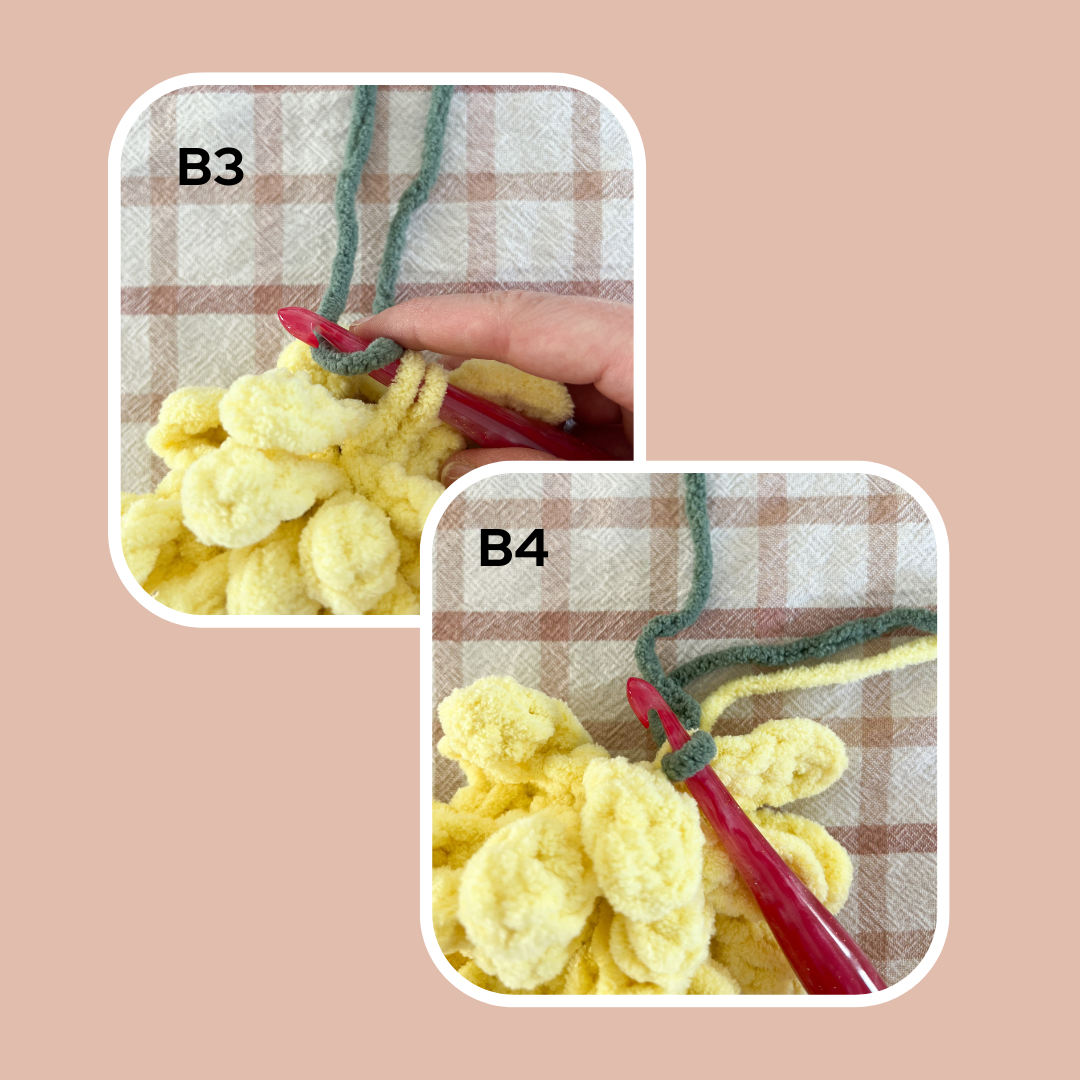 When working your LAST st of the rnd, insert your hook and pull up that first loop of the sc, drop the current color, yarn over with your new color (photo B3) and pull through the two current loops on your hook. Now, you’ll be ready to work with your new color in the next st (photo B4).