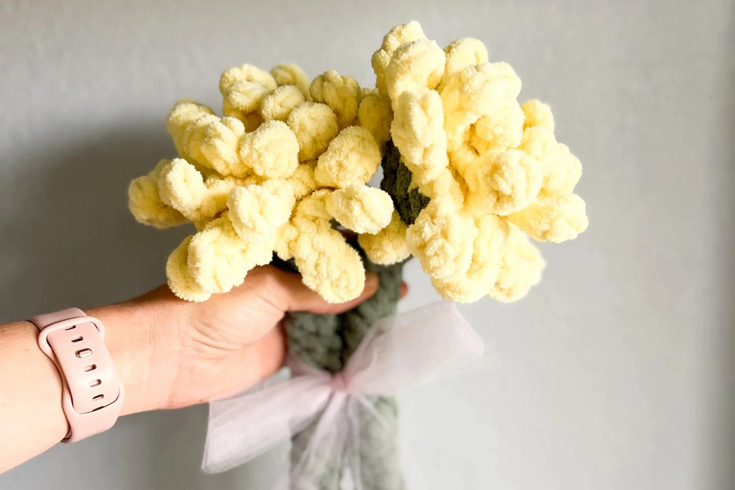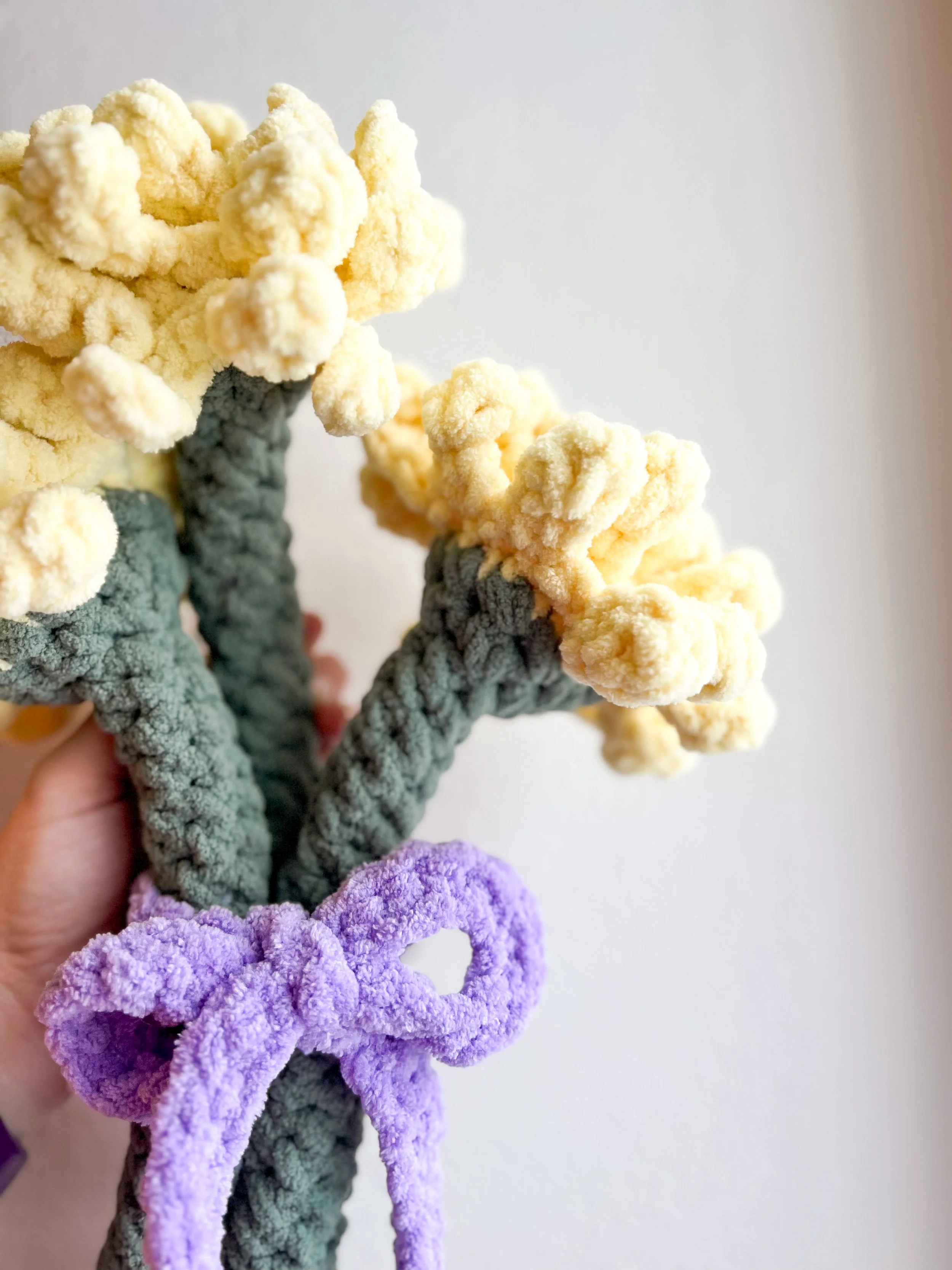 The ribbon is now long enough to tie into a bow around 3 dandelion stems. Feel free to adjust the beginning chain amount if you’d like your ribbon to be shorter or longer.