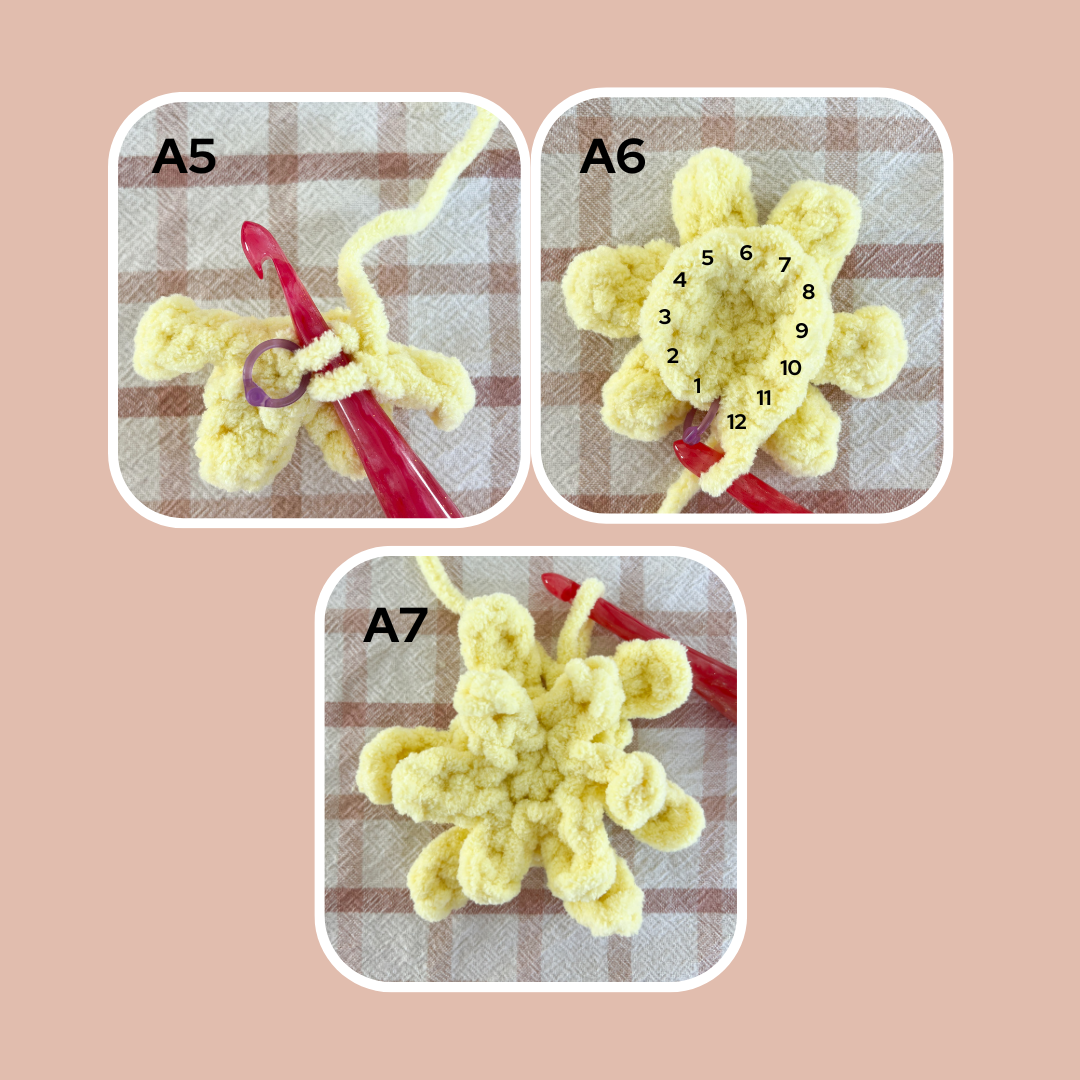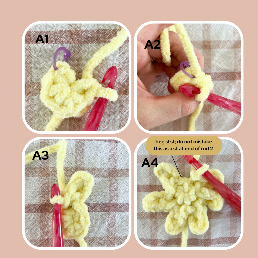 NOTE: do not mistake the beg sl st of rnd 2 with a st at the end of your rnd (photo A4).You’ll finish your last petal, then skip behind the beg petal to work into the marked back loop (photo A5).